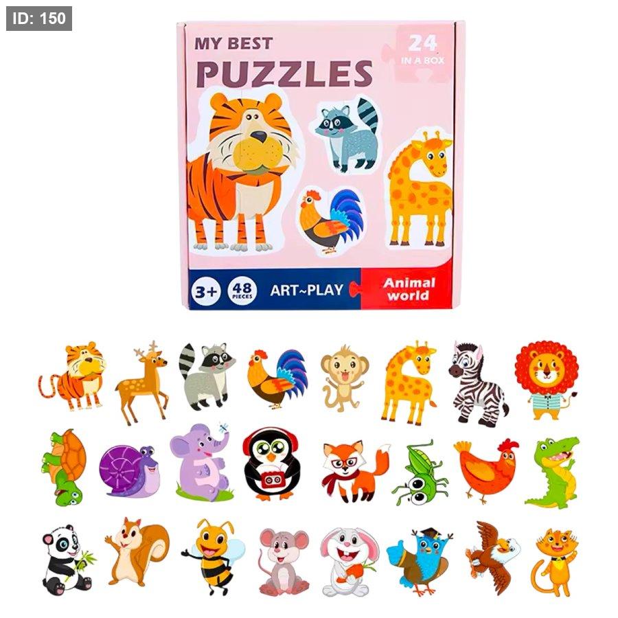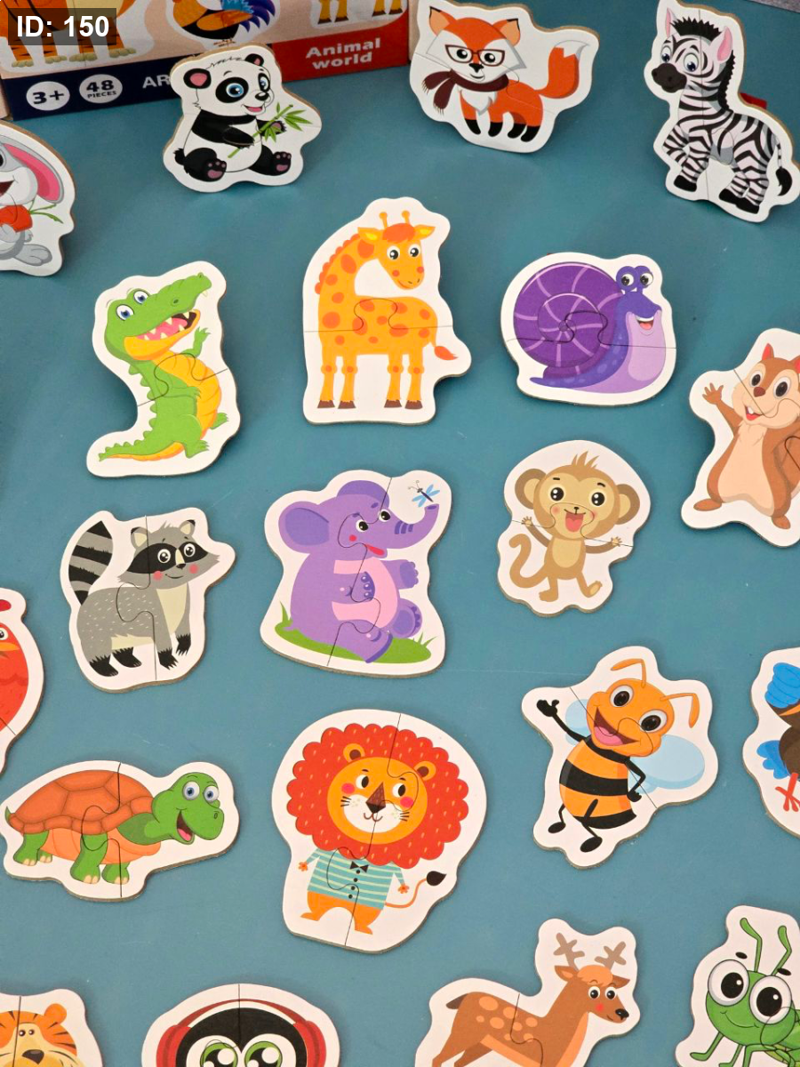 •🧩 48 قطعة بازل: كل حيوان يتكون من قطعتين (صورة الحيوان + اسمه باللغة الإنجليزية).