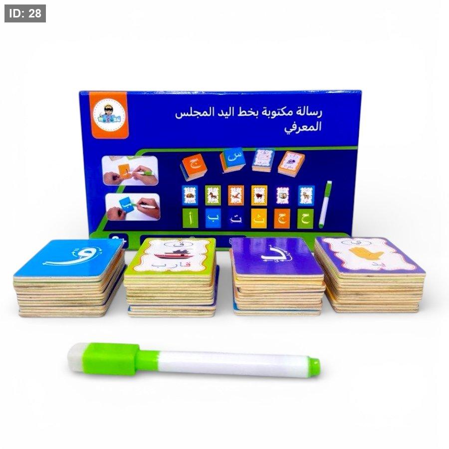هذا الصندوق يحتوي على كروت تعليمية خشبية لكل حرف من حروف اللغة العربية، مرفقة بصورة وكلمة لكل حرف لتسهيل الفهم والتطبيق. بالإضافة إلى ذلك، يأتي مع قلم خاص للتدريب العملي على كتابة الحرف بالتفصيل، حيث يوضح كل كرت كيفية كتابة الحرف خطوة بخطوة حتى الوصول إلى نهايته.