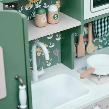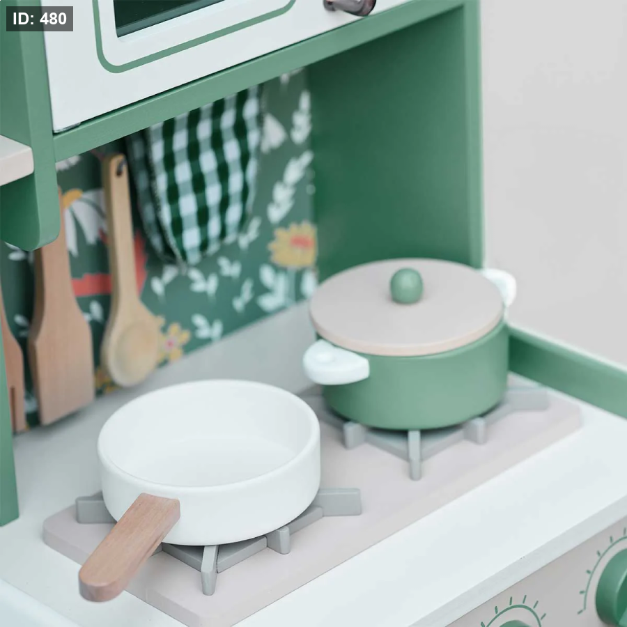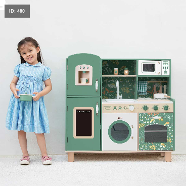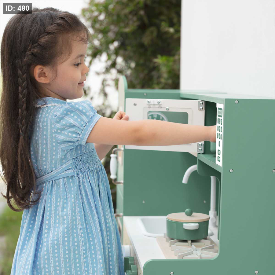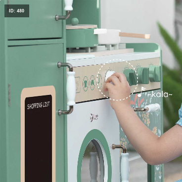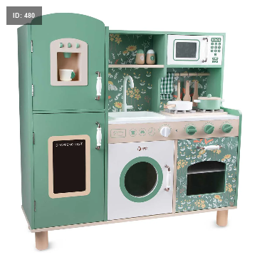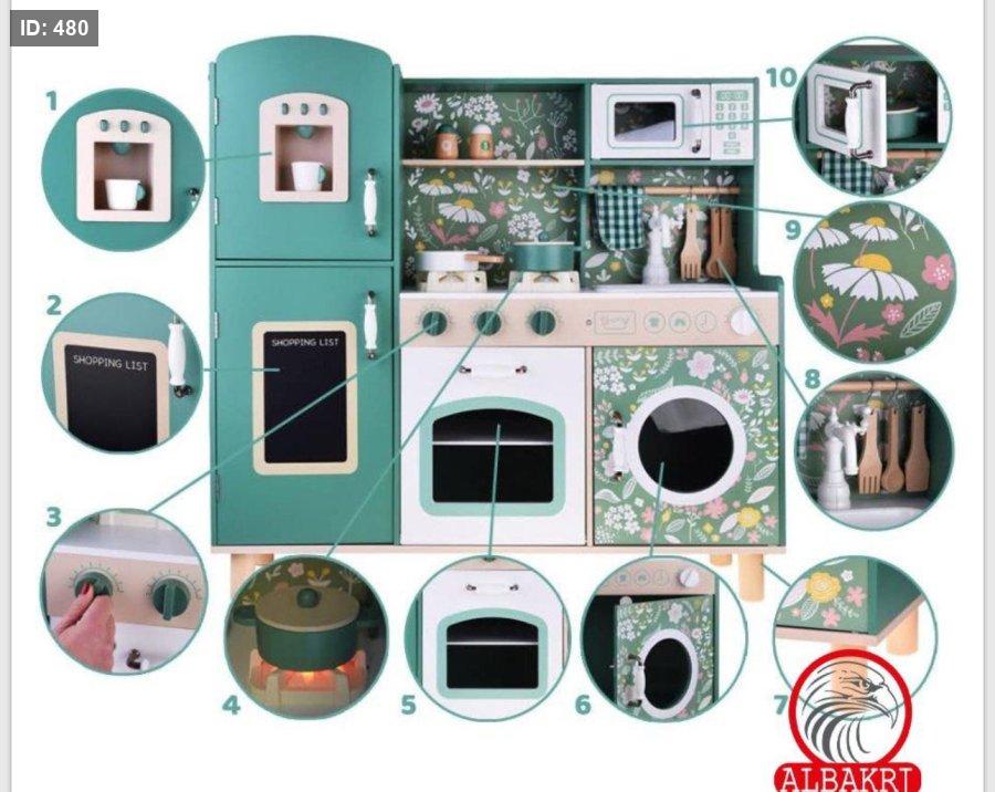يتضمن المطبخ كل ما يحتاجه صغيرك ليبدع في عالم الطبخ: فرن، غسالة، ثلاجة، مايكرويف، موقد، وصنبور مع أدوات الطهي الخشبية الصغيرة.
