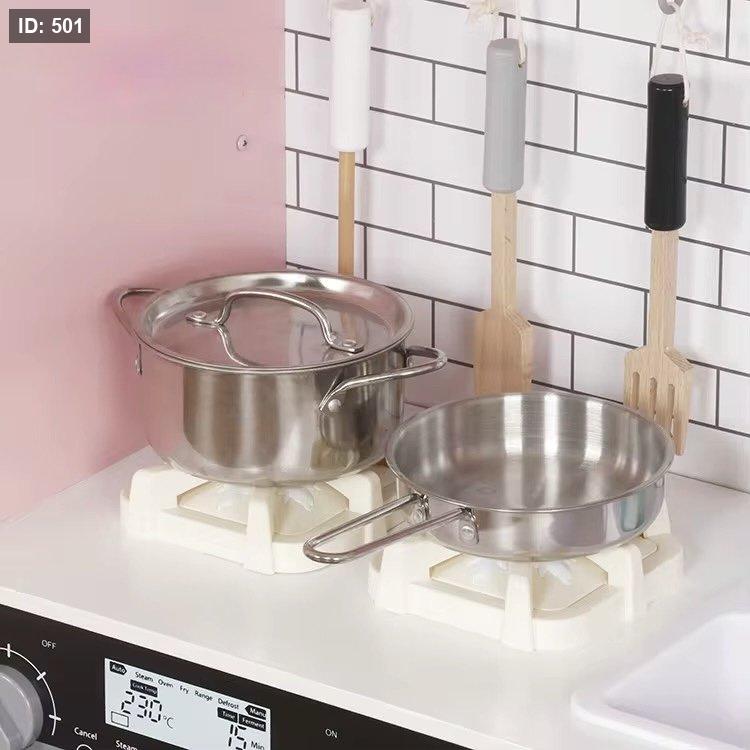 يتضمن الملحقات مثل قدر، مقلاة، وأدوات مطبخ.