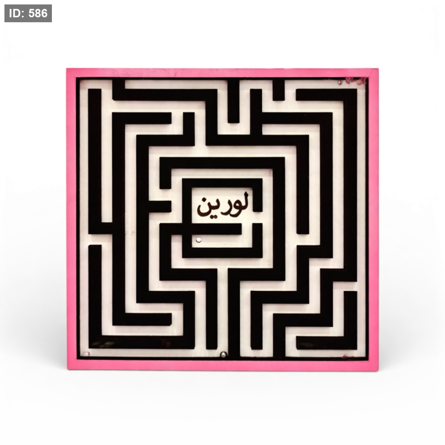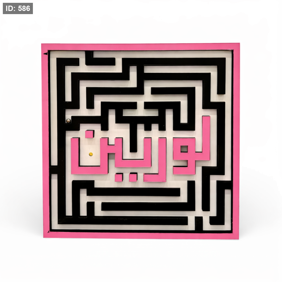 يتم دمج اسم الطفل داخل تصميم المتاهة نفسه بشكل أنيق ومميز.