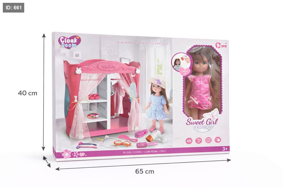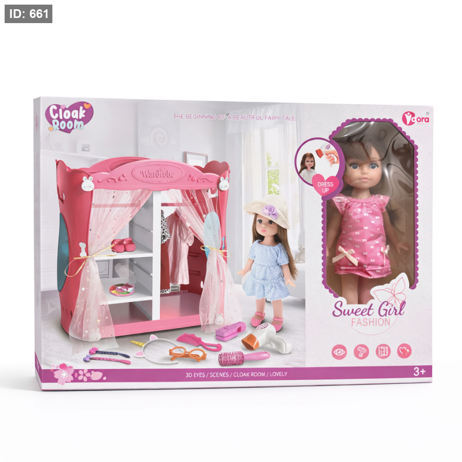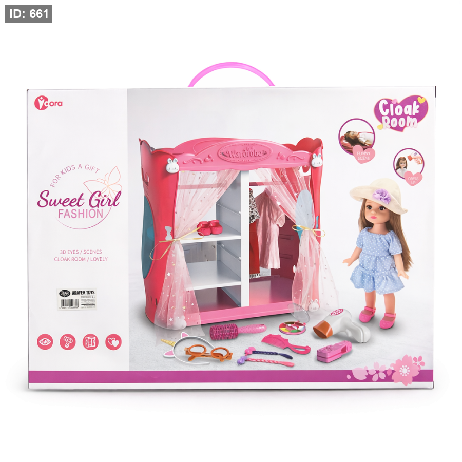 تتميز الخزانة بتصميم جميل مع ستائر ورفوف لتخزين الملابس والإكسسوارات، كما تحتوي المجموعة على أدوات تصفيف الشعر وقطع متعددة تضيف المزيد من المرح أثناء اللعب. تساعد هذه اللعبة الأطفال على تنمية خيالهم وتعزيز مهارات الإبداع واللعب التمثيلي.